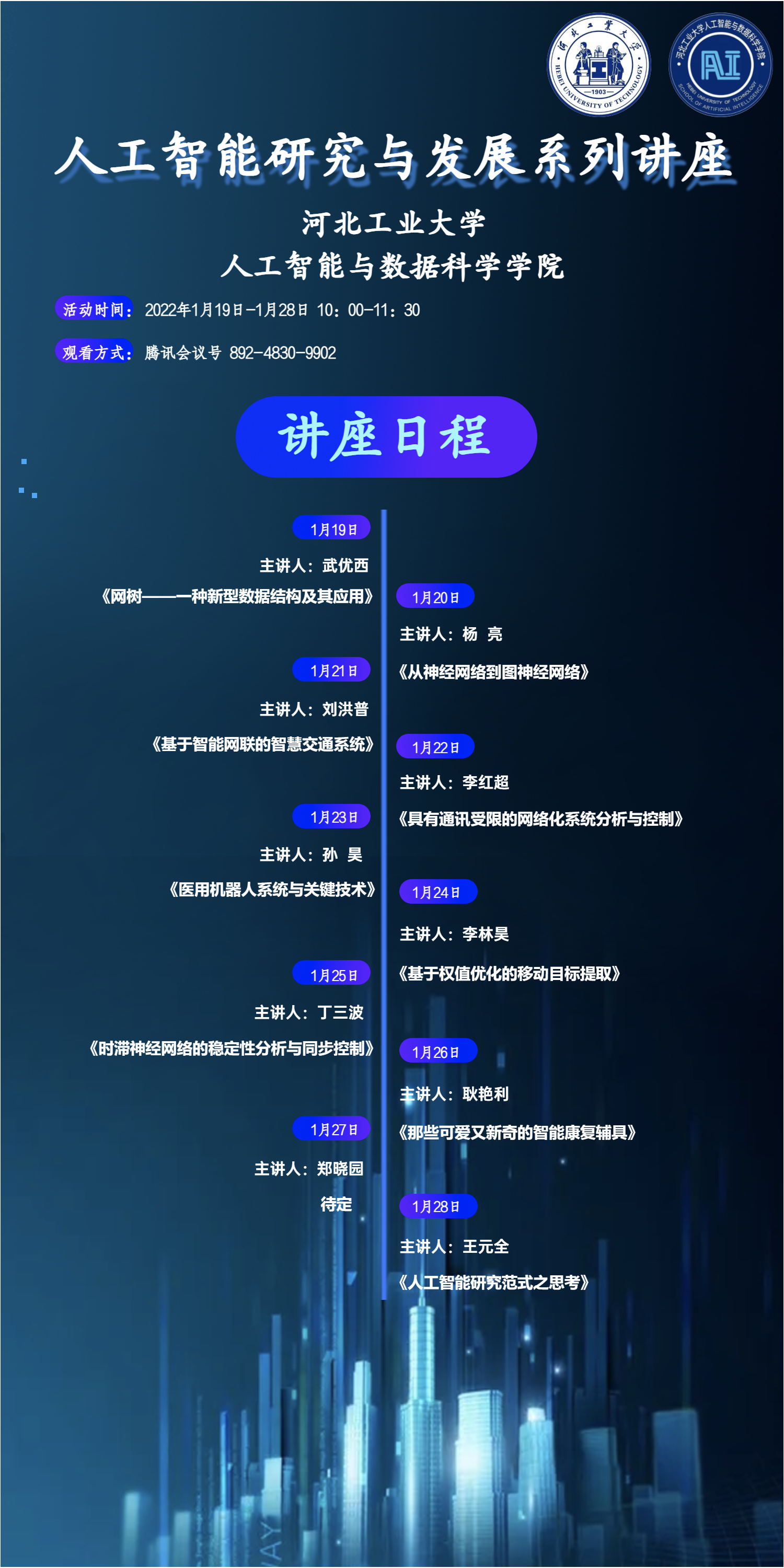 2022年寒假期间,永利集团官网师生以做好自身本职工作支持“抗疫行动”。为了丰富留校研究生的科研生活,扩大师生的科研视野,公司组织由多名“元光学者”组成的中青年骨干教师,为全校师生带来了“人工智能研究与发展系列讲座”。讲座内容包括智能康复、医疗机器人、智能交通、神经网络与复杂系统控制、新型大数据技术等多个人工智能前沿领域。欢迎广大师生参加。