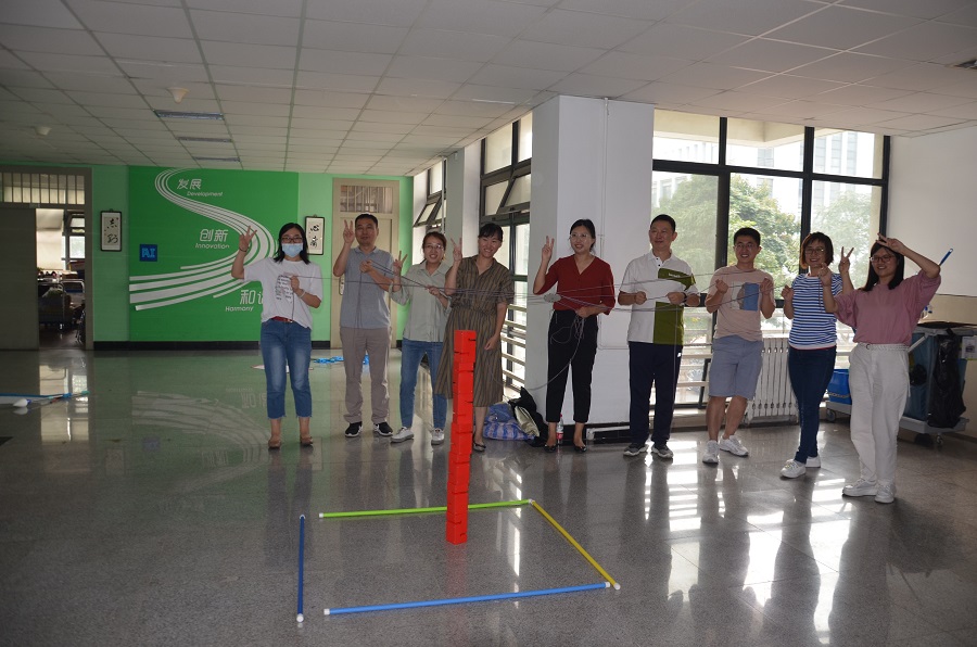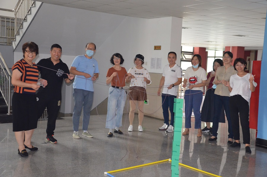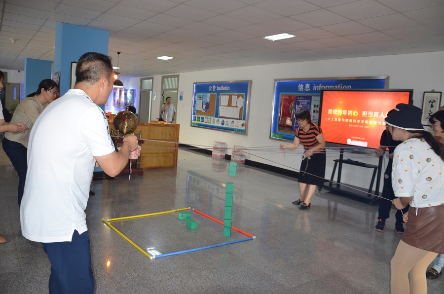 插花和月饼制作之余,老师们还分成两个组,进行团队游戏比拼。“合力搭建”需要小组内每个老师控制着一根绳子,大家一起拉紧绳头来控制塔钩移动,用塔钩将一块块塔吊起垒高。“神笔马良”则在全部绳子的中间绑一根大毛笔,众人齐力控制大毛笔在卡纸上写下“AI”。两项游戏既考验团队成员的团结协作能力,同时也对每位成员的专注与耐心提出要求。
