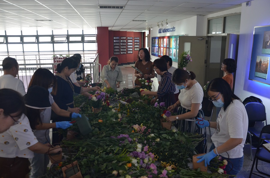 在插花活动中,全体教职工亲自动手,经过约2个小时的挑选、修剪、插植,一盆盆错落有致、生机盎然的插花作品展现在大家眼前,看着通过自己双手制作成的插花作品,大家脸上都洋溢着喜悦的笑容,纷纷用相机记录下这精彩瞬间。