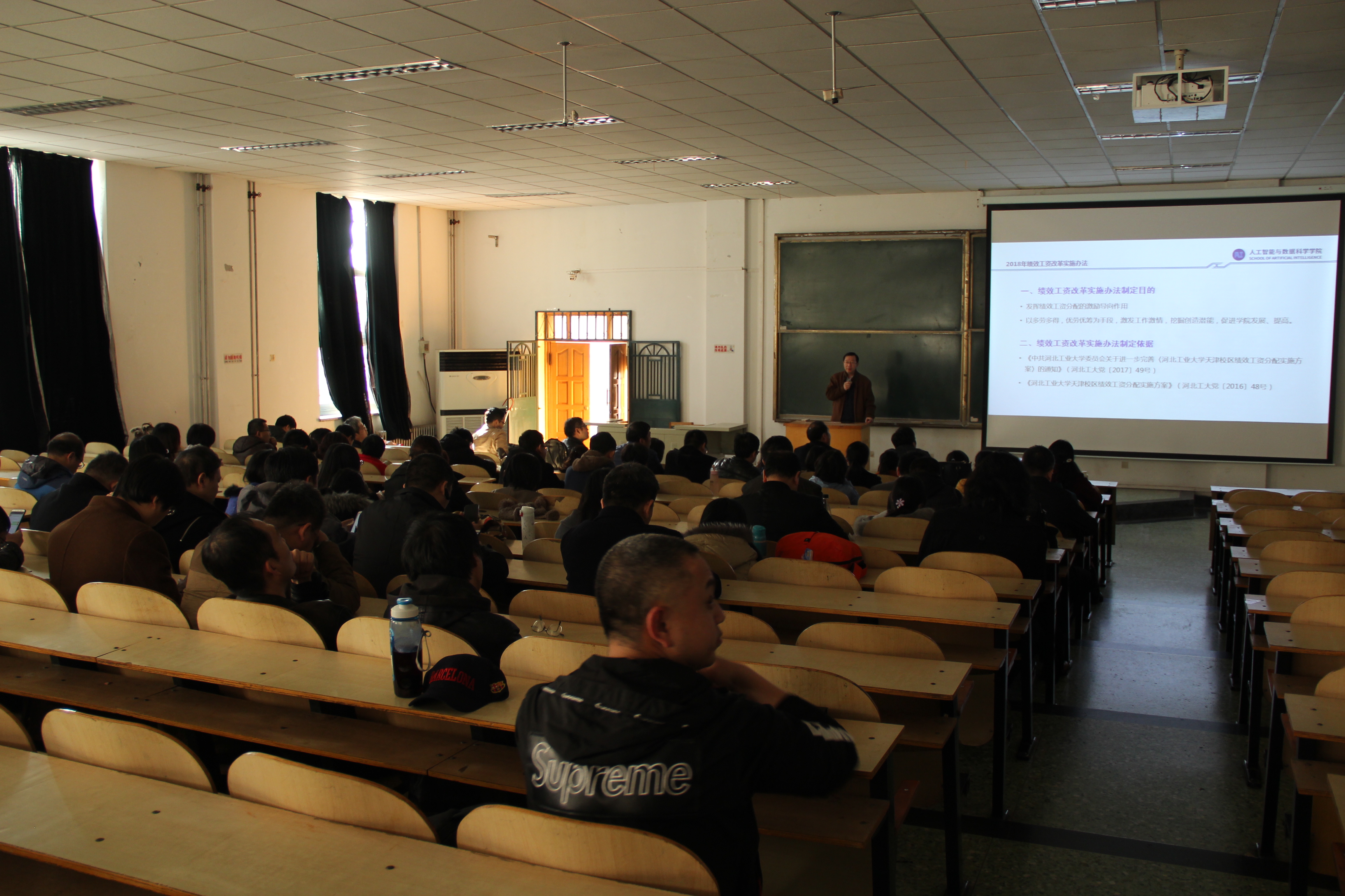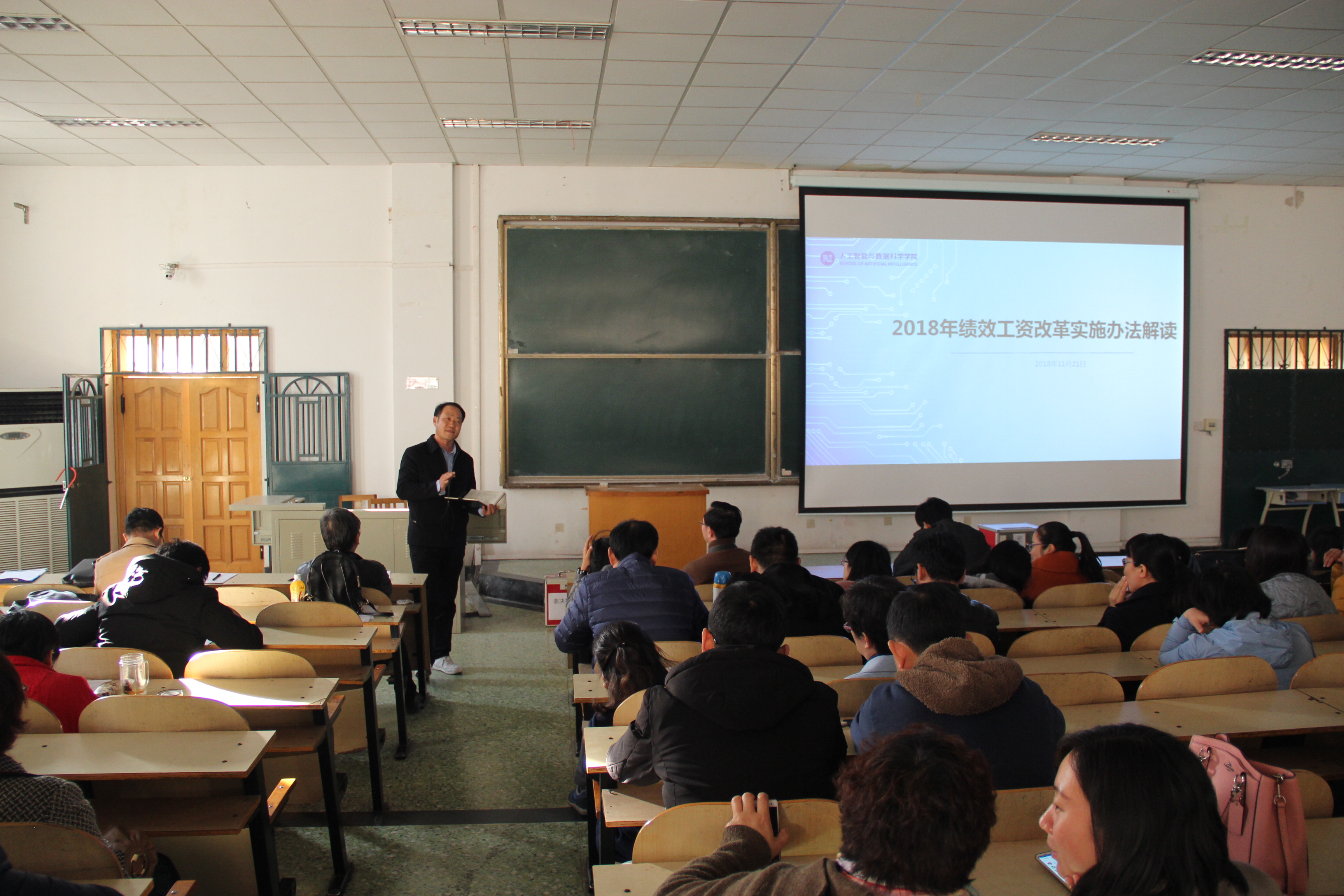 经理杨鹏对《2018年绩效工资改革实施办法》进行说明。他强调,公司2018年绩效考核及分配实施办法以公司有关政策和绩效评价为依据,坚持“绩效优先,兼顾公平”的原则,发挥绩效工资分配的激励导向作用,以多劳多得,优劳优筹为手段,激发工作激情,挖掘创造潜能,促进公司发展。杨鹏经理围绕《实施办法》中教学工作量计算办法、教学科研绩效核算办法、辅助工作量计算办法、突出贡献奖励办法等具体内容进行详细解读,并就教职工提出的意见和建议逐条进行回复。