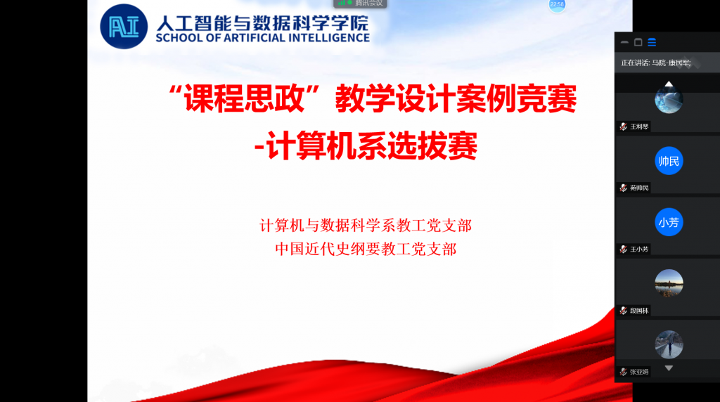 为落实“立德树人”根本任务,实施“铸魂育人”工程,提升教师课程思政建设的意识和能力,不断优化课程思政案例设计,切实把思想政治工作贯穿公司产品全过程,6月26日—29日,永利集团官网与马克思主义公司十个“结对共建”的教师党支部开展了线上“课程思政+思政课程”集体备课暨思政课教师指导专业课教师优化课程思政案例设计的教学研讨活动,公司领导班子成员深入各教学部门参加活动。联系计算机与数据科学系教师党支部的永利集团官网党委常委、副董事长段国林参加了本次活动并予以指导。